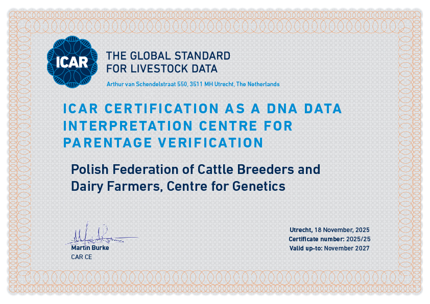 Centrum Genetyczne PFHBiPM (CGen), dołączyło do grona akredytowanych jednostek ICAR (International Committee for Animal Recording). Certyfikacja potwierdza, że procedury kontroli pochodzenia oparte na markerach SNP, które stosuje CGen są zgodne z międzynarodowymi standardami.